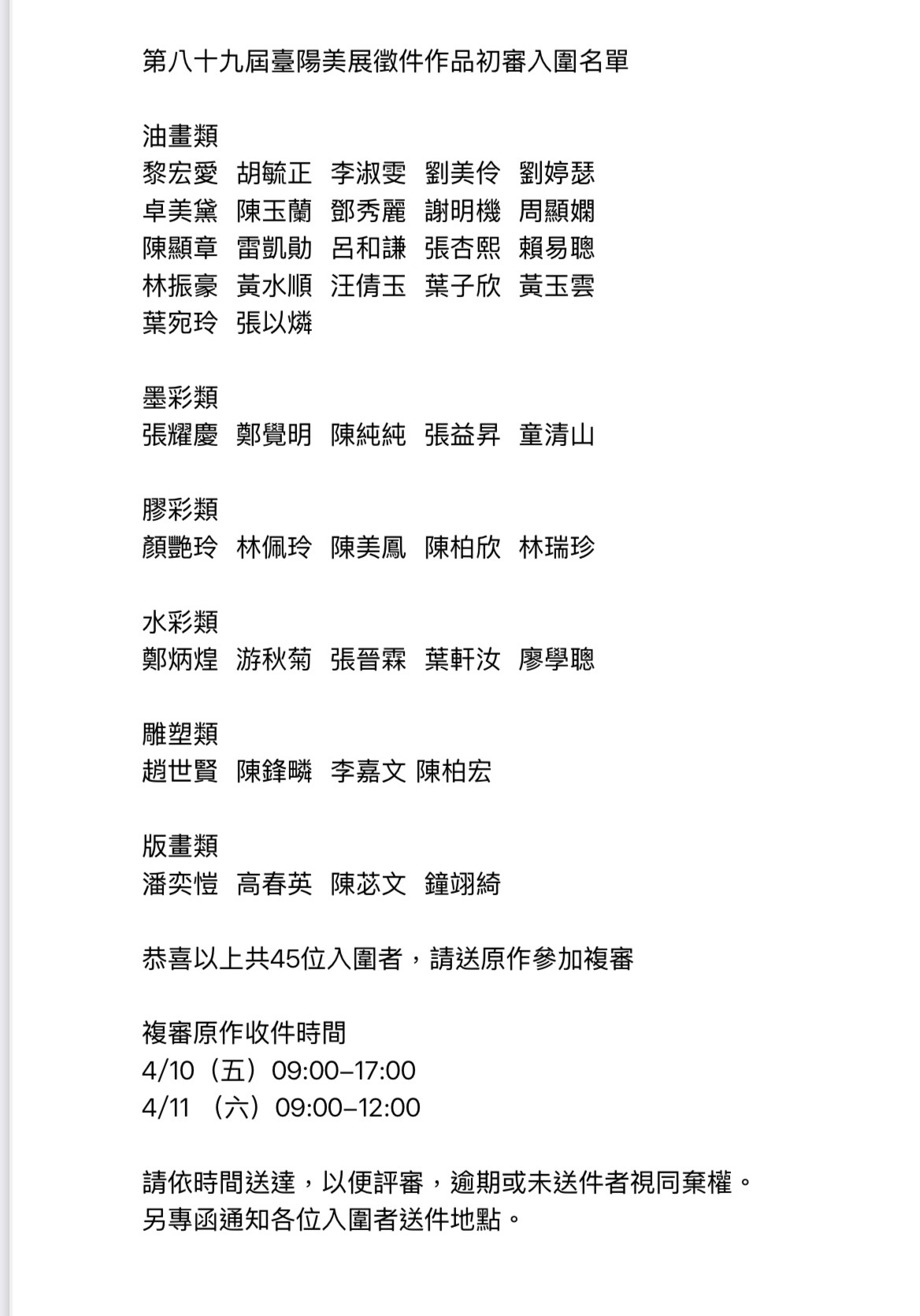 第八十九屆臺陽美展徵件作品初審入圍名單